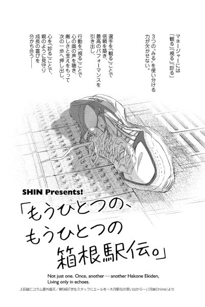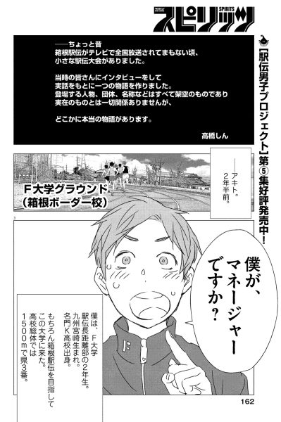 本作は、1987年の箱根駅伝で実際に10区アンカーを走った経験を持つしん先生が、大学陸上部でマネージャーを務めたOBの皆様や山梨学院大元監督・上田様との取材を重ね、今から約30年以上前の実話をもとに、当時の時代を背景に描かれた作品です。
