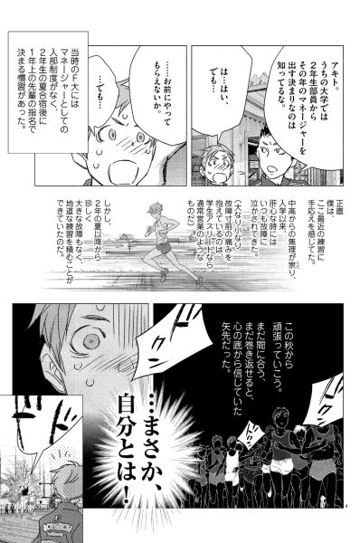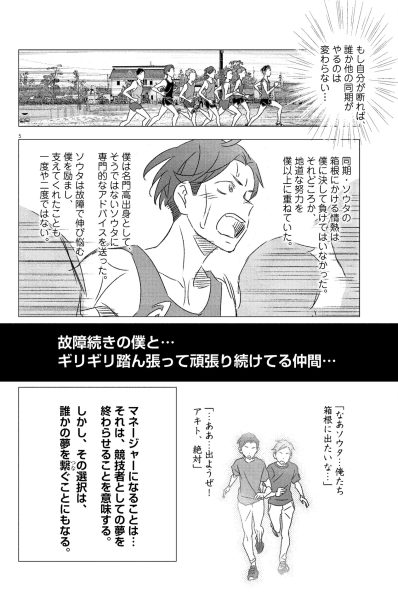 忙しい日々の先で、「アキト」は、F大学駅伝部の主務としてチームの中心に立つ存在へと変わっていた──。